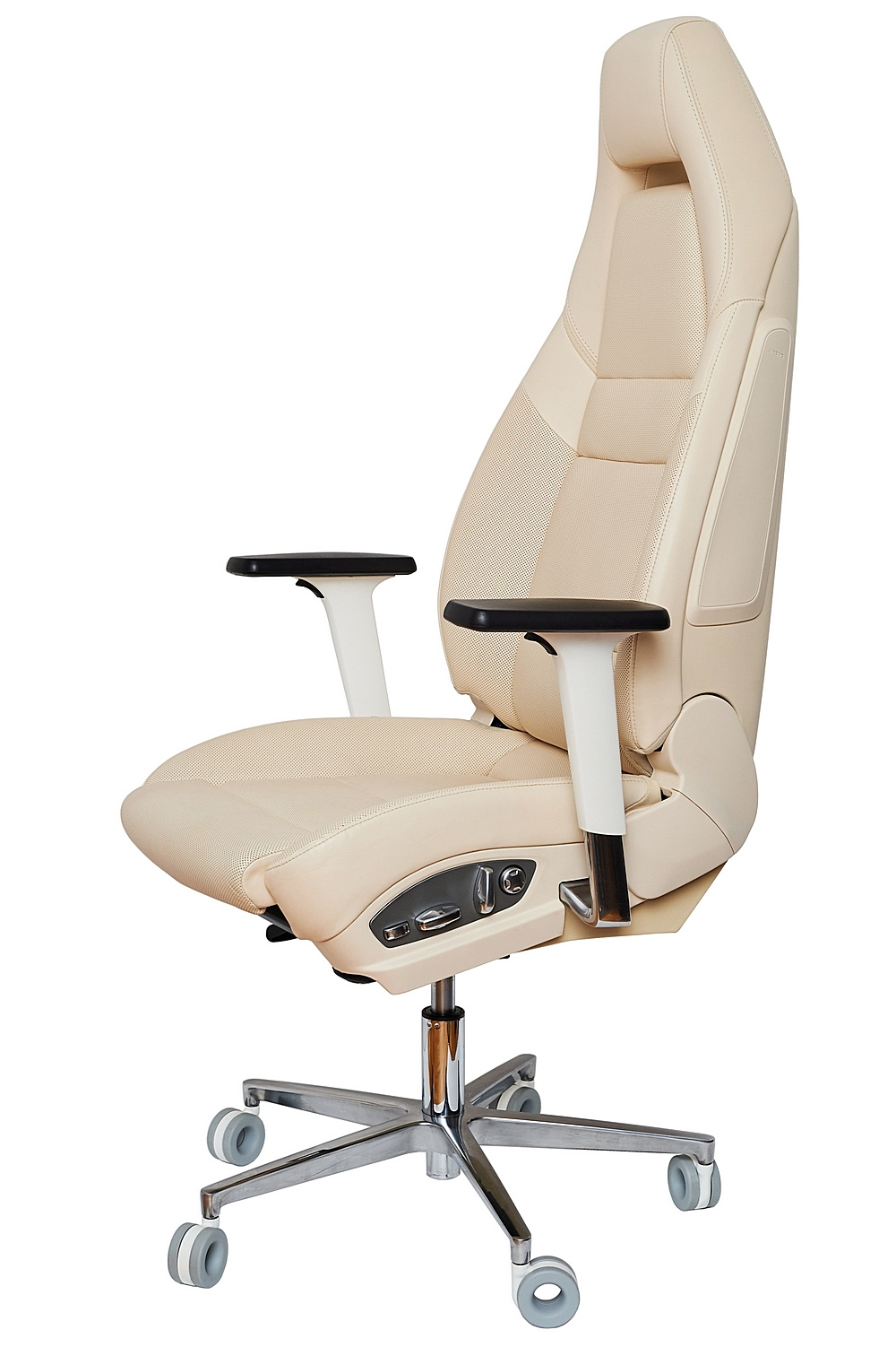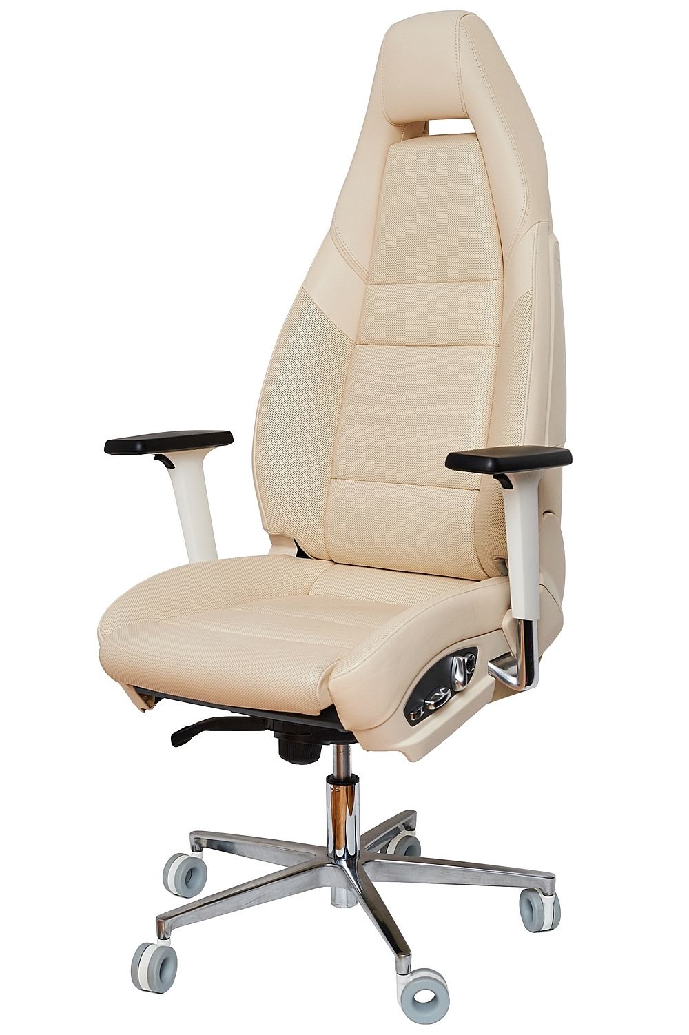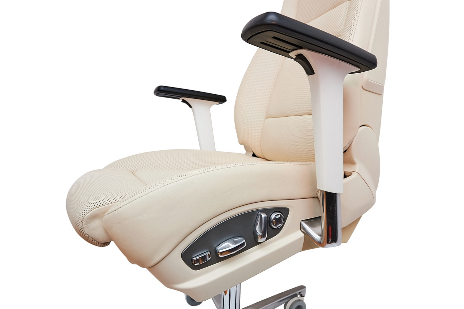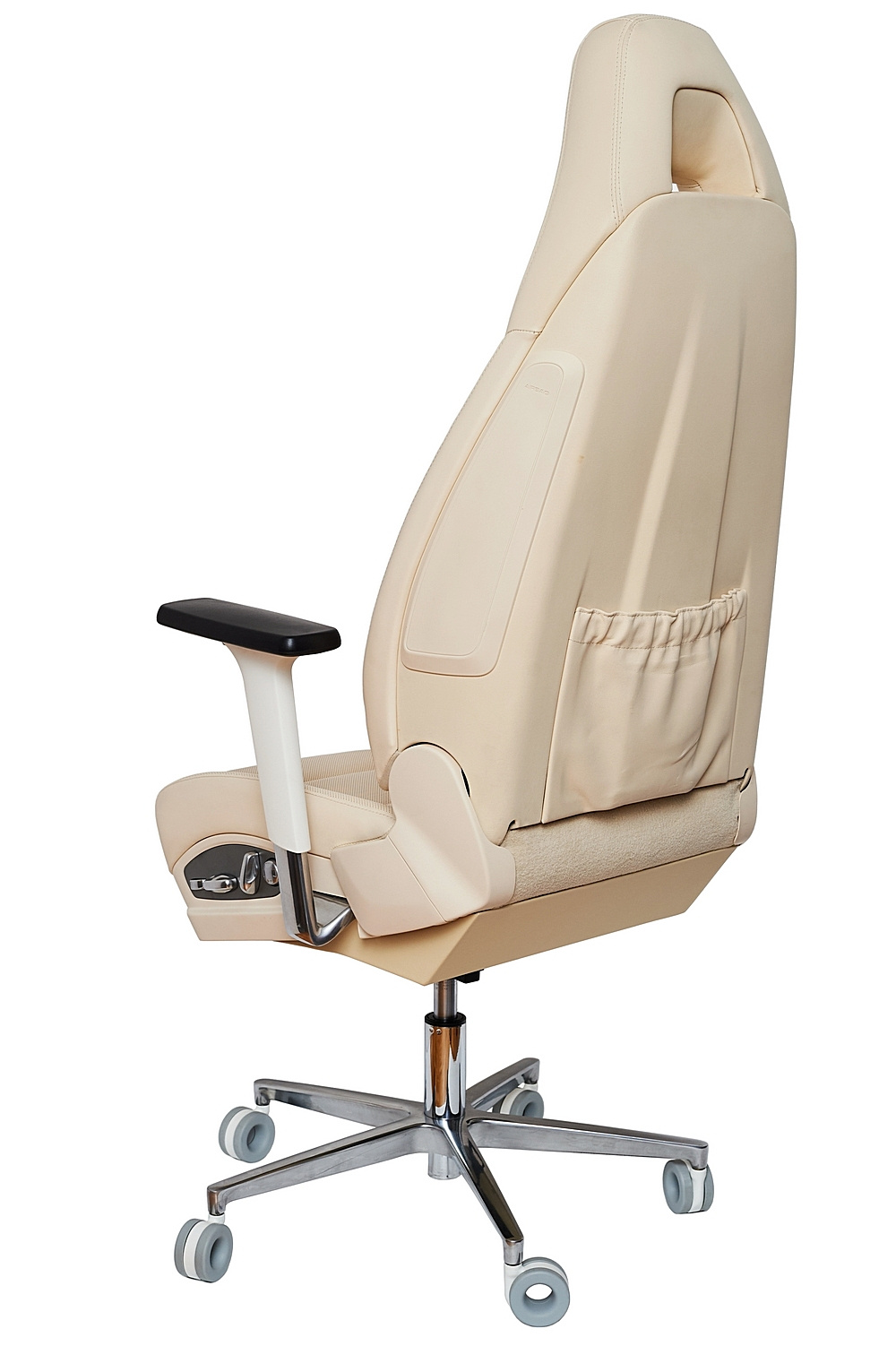 Original leather seat from a Porsche Panamera converted into an office chair. Built-in 14Ah gel batteries allow you to control selected functions of the chair: