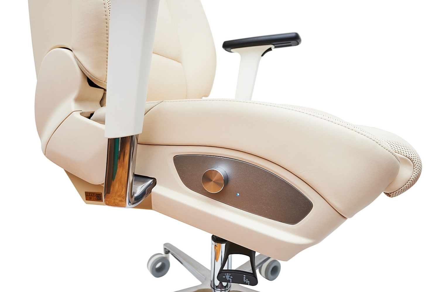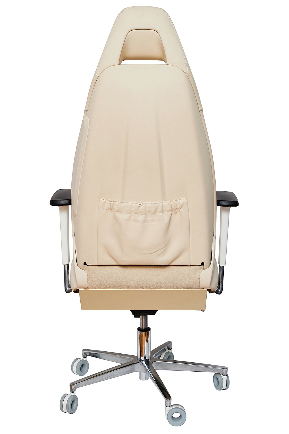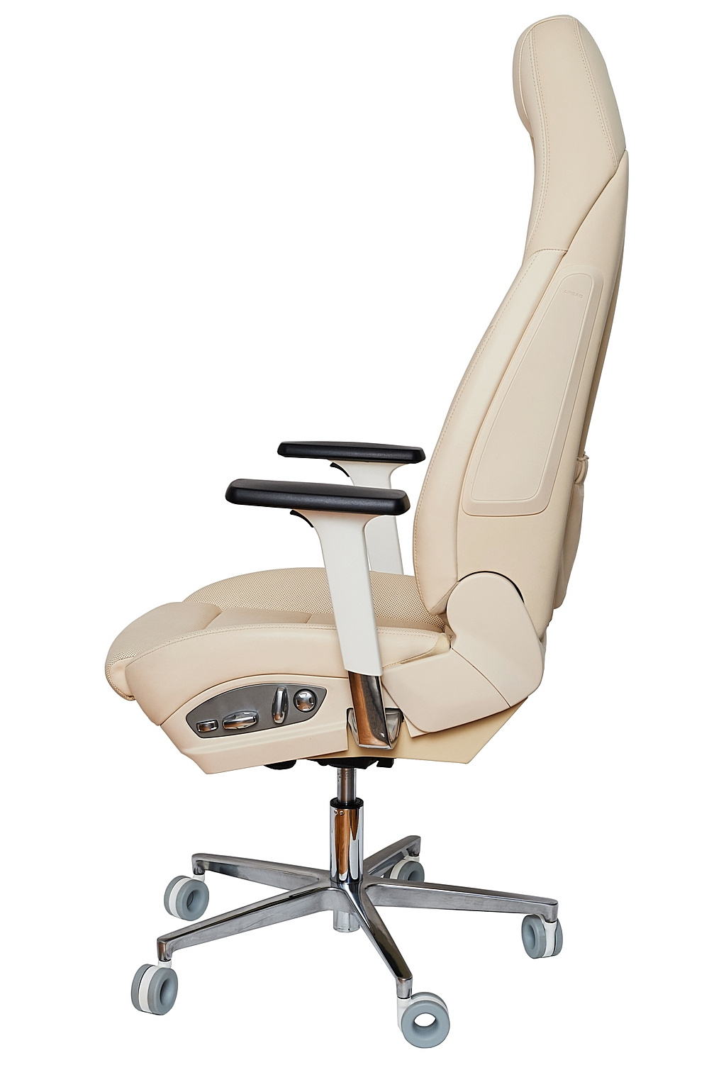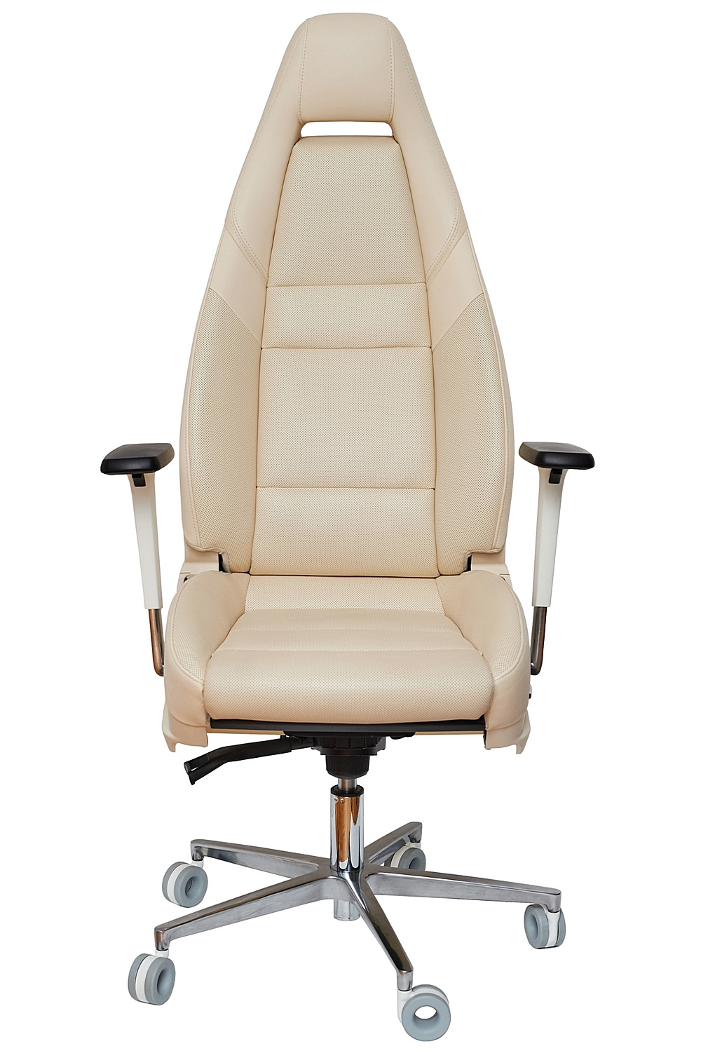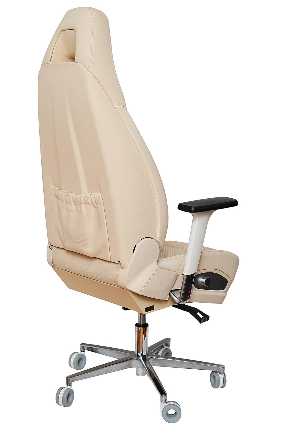 Original leather seat from a Porsche Panamera converted into an office chair. Built-in 14Ah gel batteries allow you to control selected functions of the chair: